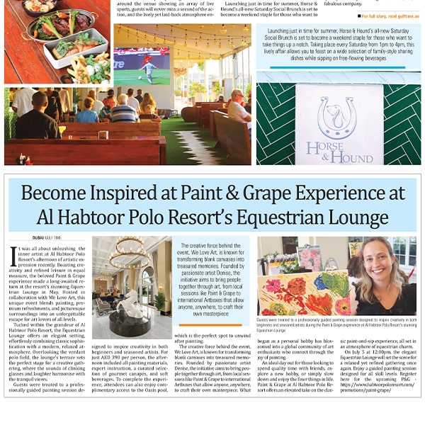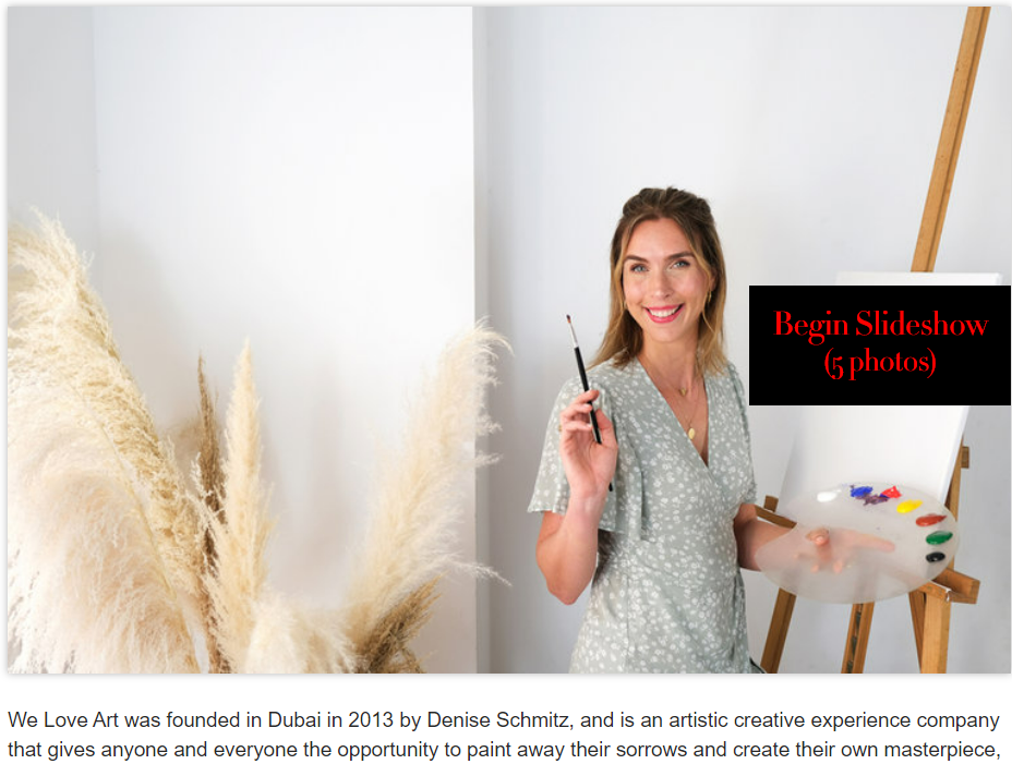 Our spotlight moment In the Press We Love Art Featured on Web-Release.com for Upcoming Paint & Grape Experience We Love Art featured on Best Things to do in Dubai on Conde Nast Traveller for July 2025 We Love Art Featured on Khaleej Times for Fun Ways to Spend the Weekend Become Inspired at Paint & Grape Experience at Al Habtoor Polo Resort’s Equestrian Lounge Brushes and Beyond in Goodness Magazine We Love Art: Best Art and Painting Event 2023 Money & Me: ‘I’d rather spend on experiences than materialistic things’ We Love Art: Colour Your Senses We Love Art: The Experience Guaranteed To Improve Your Mental Health Full Episode Denise Schmitz We Love Art We are ecstatic to announce Denise Schmitz Human Fraternity: Expo Dubai pavilion showcases common humanity through art Load More Loading More... You’ve reached the end of the list