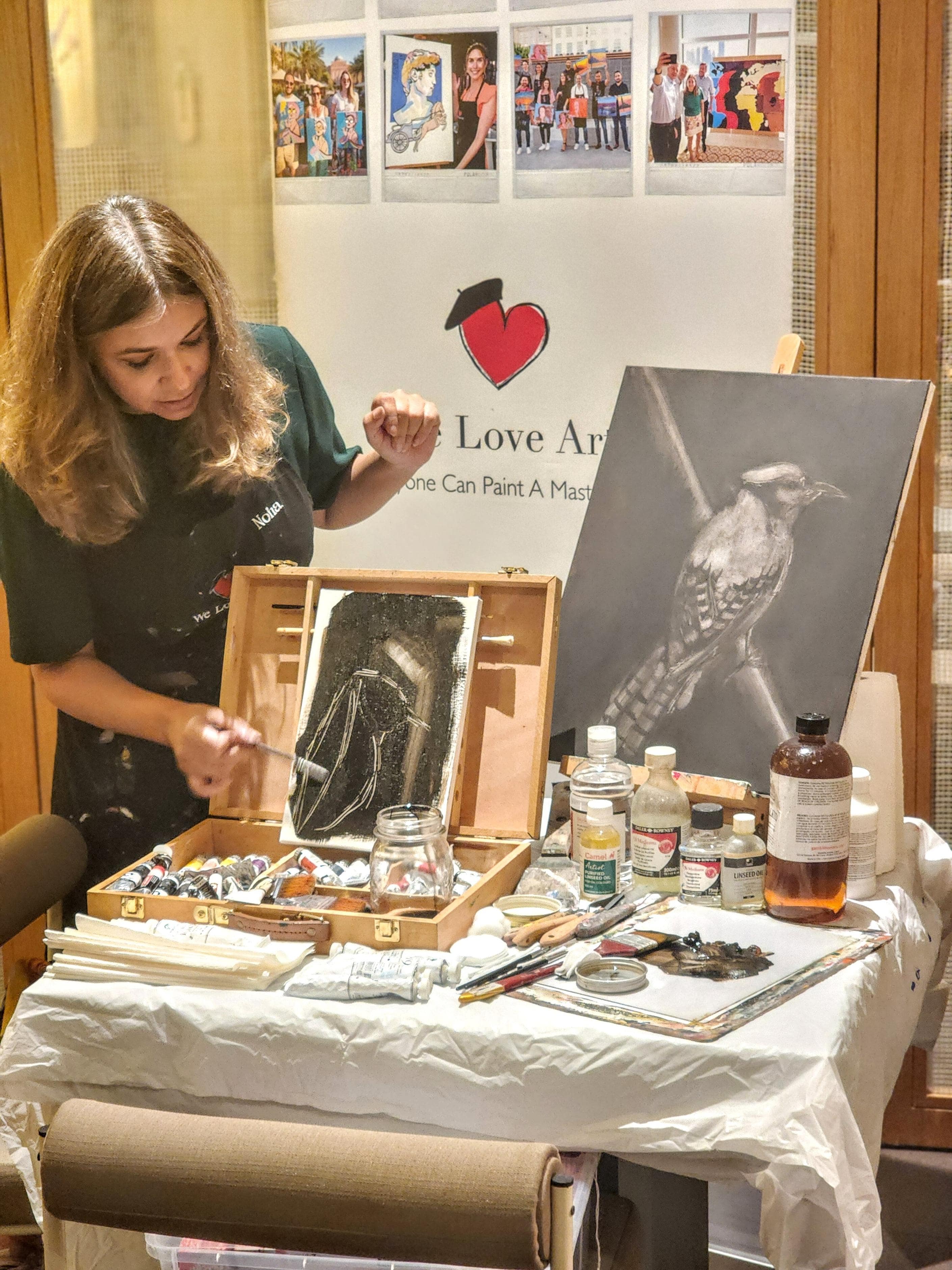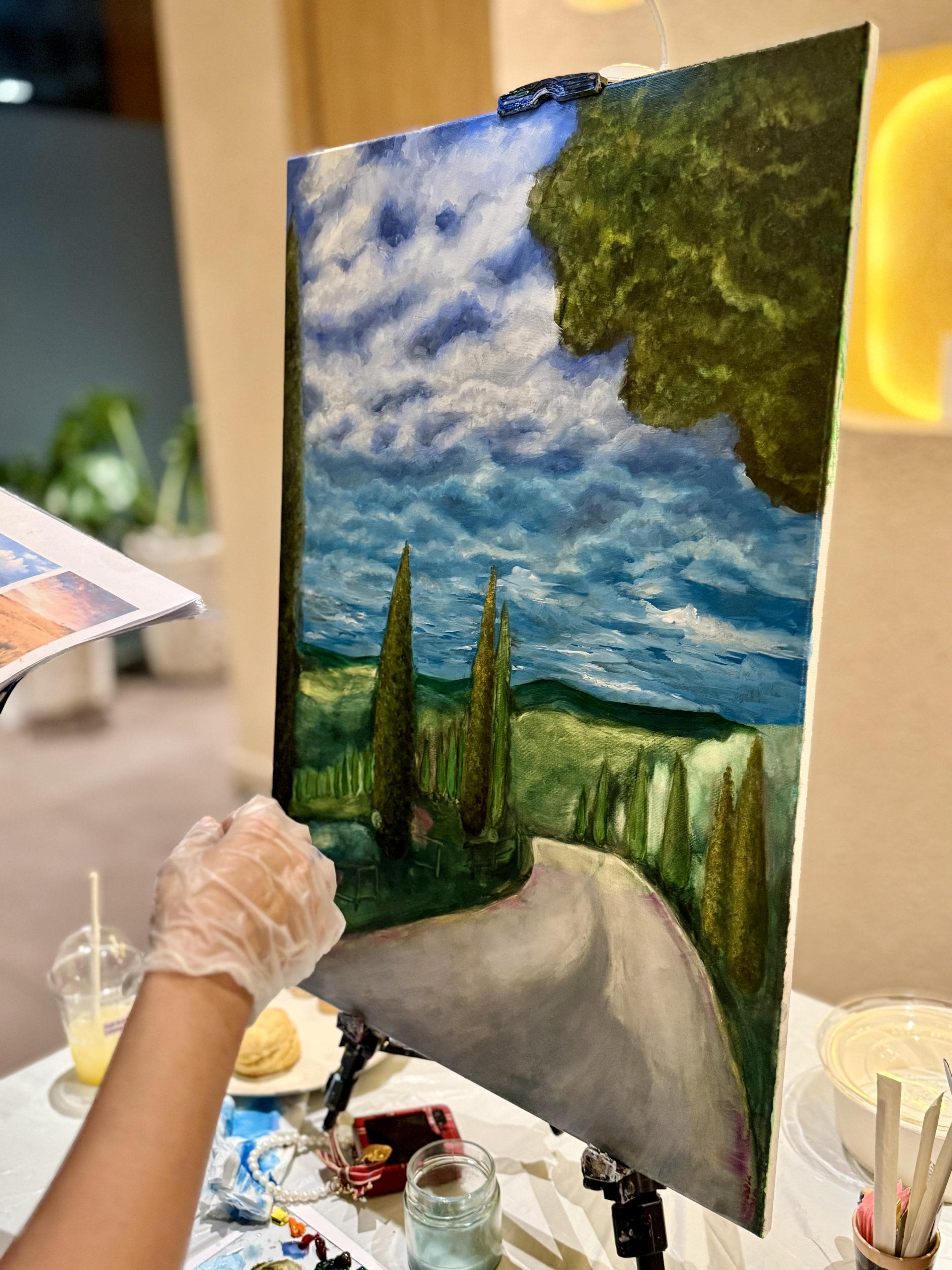 Most modern oil paints are safe to use, and we offer gloves for those who want to keep their hands clean. We also use odorless thinner instead of traditional solvents to create a more comfortable and fume-free environment. which reduces fumes and makes the environment safer for those with sensitivities. If you have specific allergies, let us know in advance so we can accommodate your needs.
