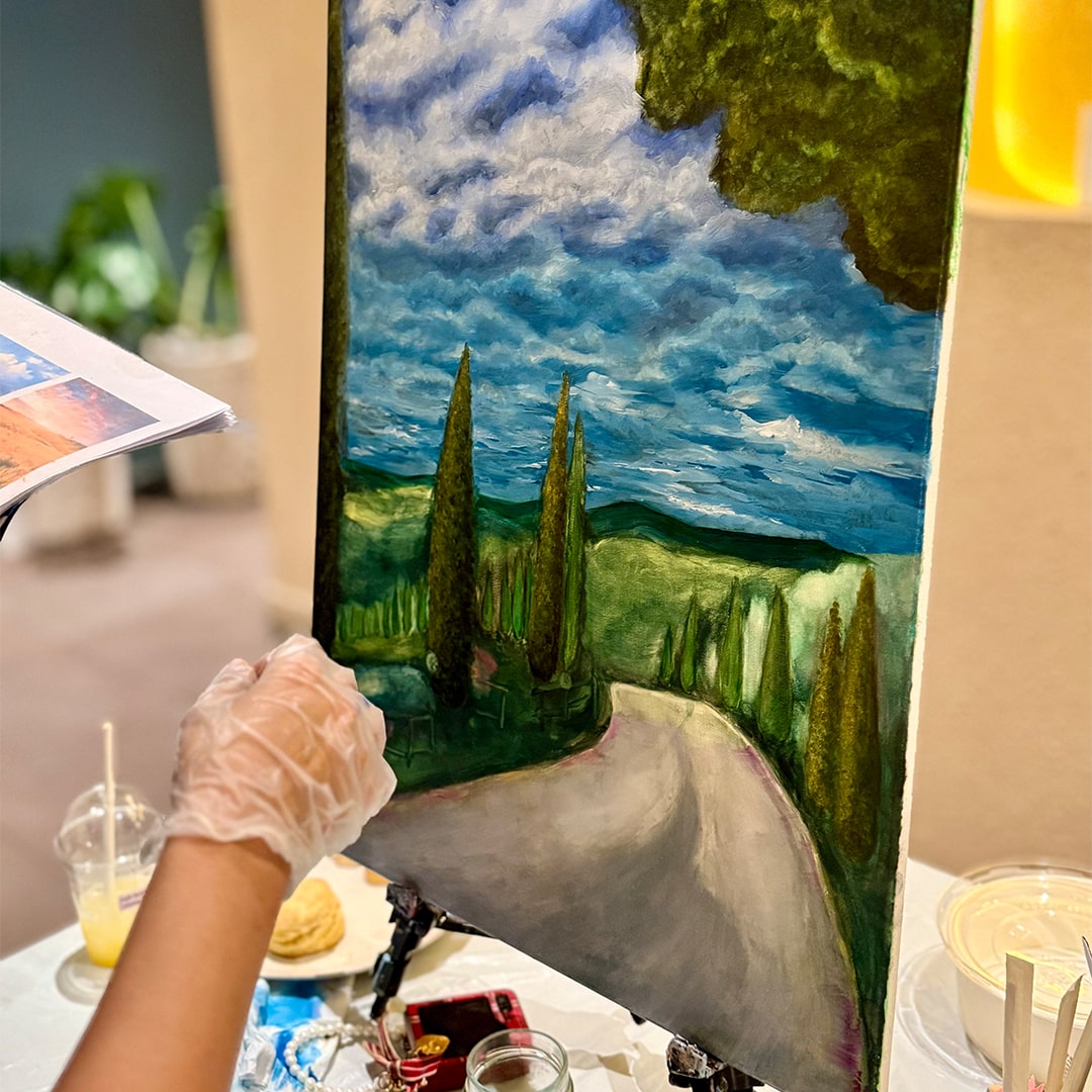 No experience is necessary! Our oil art courses in Dubai are designed for all skill levels, from beginner painting to experienced painters. Each class includes step-by-step guidance to help you complete your painting with confidence.