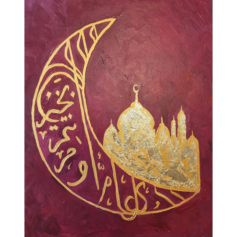 This enchanting painting of a golden crescent moon, adorned with shimmering gold leaf, evokes a sense of nostalgia and wonder. Inspired by Middle Eastern culture, it symbolizes beauty and aspiration, inviting you to reflect on ancient stories and timeless dreams. The warm glow of the crescent whispers of connection and heritage, guiding us back to cherished memories.