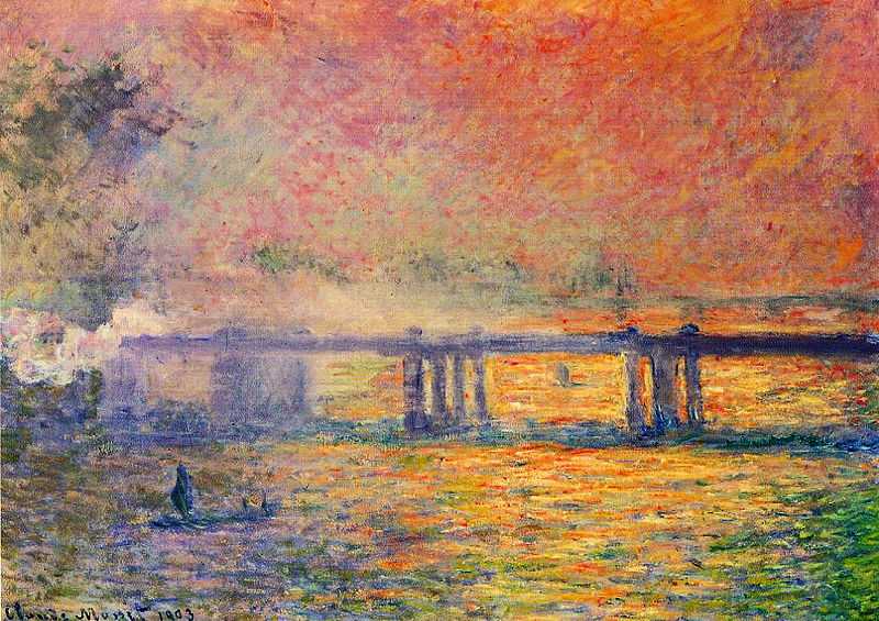 Claude Monet’s “Charing Cross Bridge,” depicts a bustling London scene with soft colours and reflections on the Thames River. The painting captures the lively atmosphere and changing light of the city.