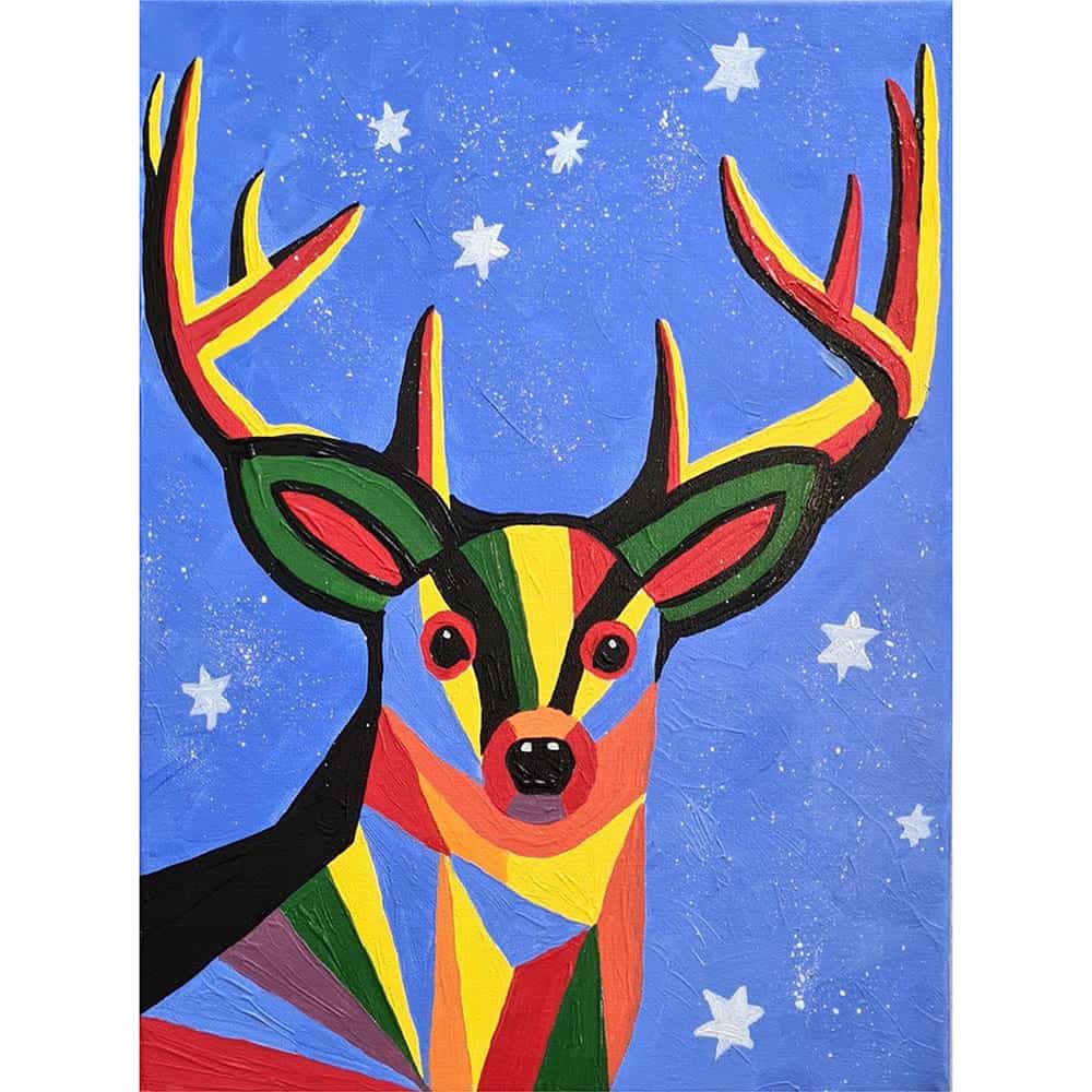 We wanted to make the first masterpiece for kids something they could connect with when they look at it on their wall. Taking Van Gogh’s Starry Night as an inspiration, the stars which surround the deer give the painting a very charismatic feeling- hence why we named this one Starry Deer. This geometric deer art silhouette adds a minimalistic and heartwarming touch to a cold holiday day, making your child gleam with joy!